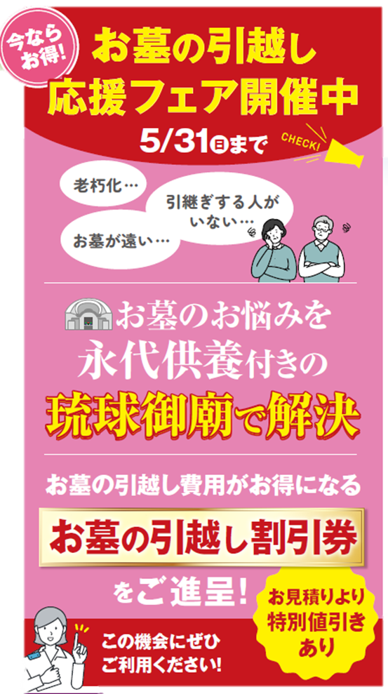 ただいま琉球御廟ではお墓の引越しフェアを開催しており5月31日までに契約した方対象に